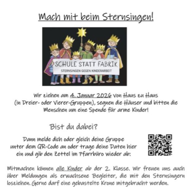 Die Aktion Dreikönigssingen 2026 steht unter dem Motto: "Schule statt Fabrik - Sternsingen gegen Kinderarmut".